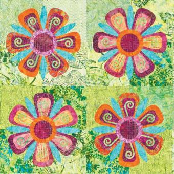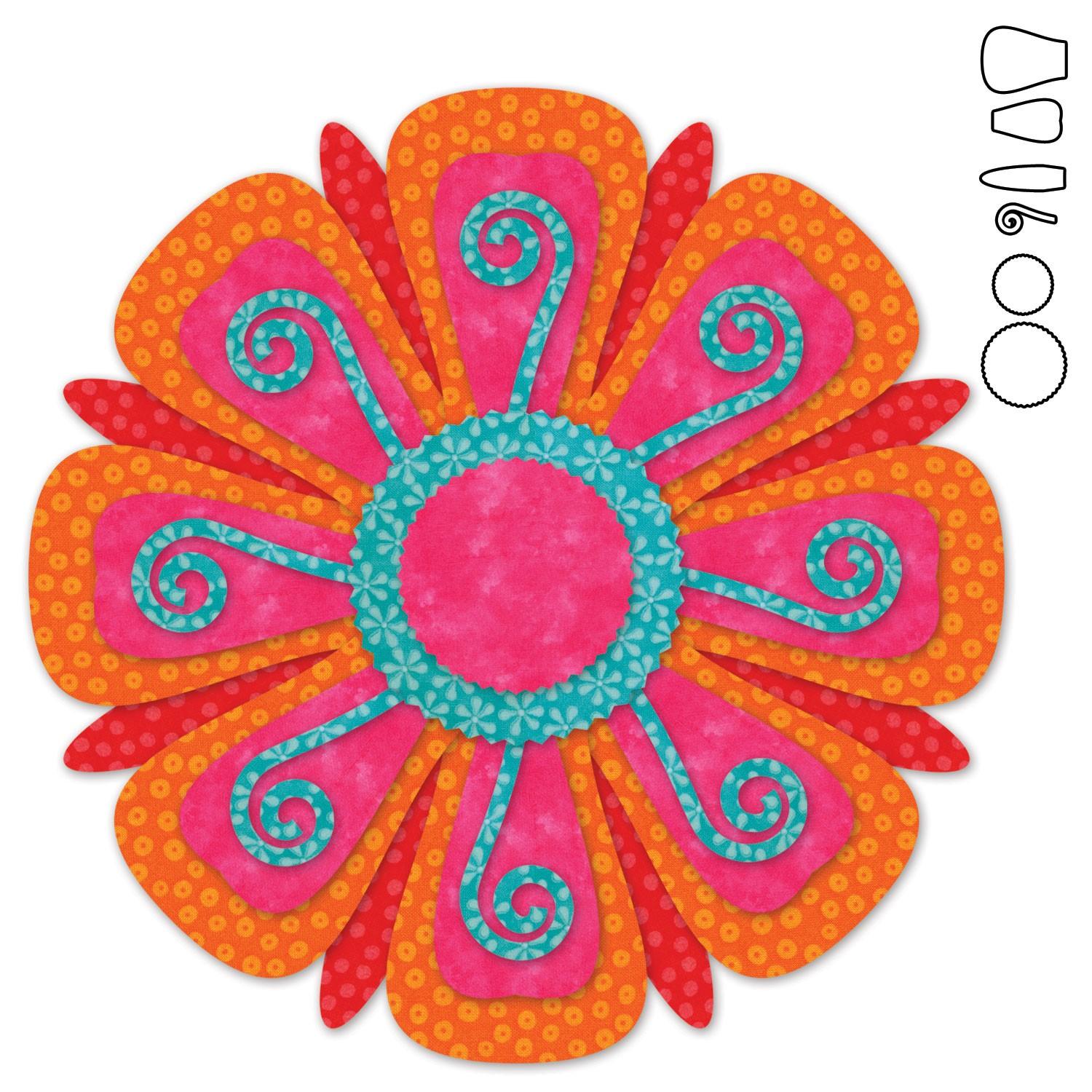 This die cuts three different sized petals, two pinked circles, and a spiral accent shape to create a 13" flower. Flowers are a favorite appliqué motif for quilters. Use for appliqué quilts, garments, gift tags, home décor and much more! Apply fusible web to the wrong side of fabrics prior to cutting for quick and easy appliqué. Die packaging includes pattern for a fun whimsical wall hanging. Fantasy Flowers design Copyright Robbi Joy Eklow. *Licensed exclusively to AccuQuilt.
