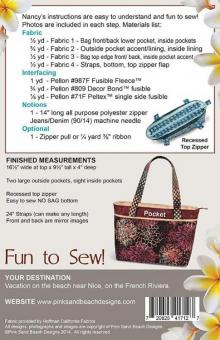 Lots of pockets! This easy to sew handbag features two outside pockets and eight more inside pockets. Keep items secure with the "easy to sew" recessed zipper and a "NO SAG" bottom using fusible interfacing. The straps can be made any length (handbag or shoulder). Kit this bag using fat quarters or yardage. Designed to fit an iPad or Nook inside. Full color instructions with pictures.