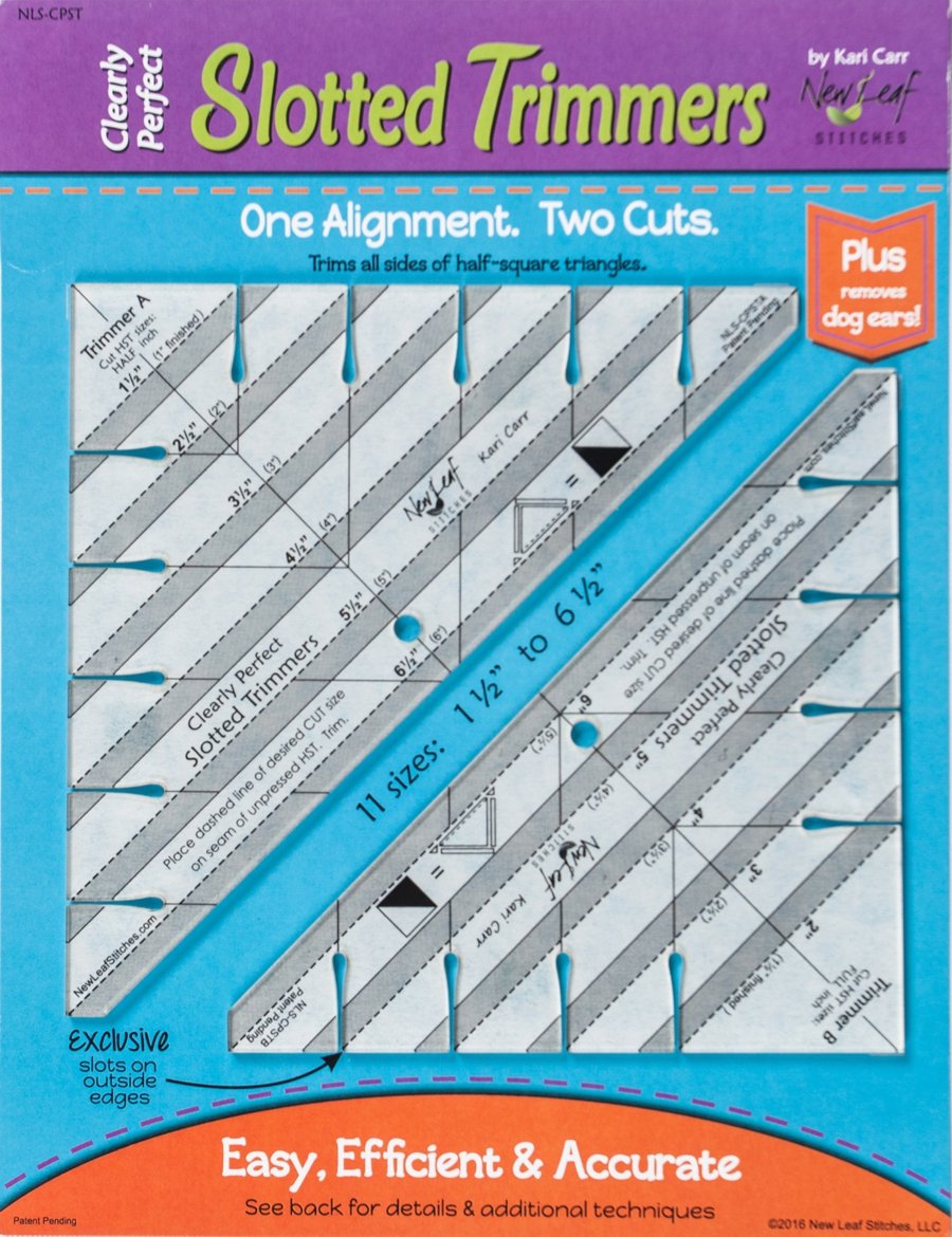 An easy, efficient & accurate method to square-up half-square triangles. Align the seam of an unpressed hst with dashed lines and with easy strokes, trim all four sides. The unique edge slots allow for trimming of the dog ears at the same time. No need to rotate fabric to realign.