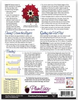 Includes: pattern and one interfacing template. You will need one template per hot pad as the triangles are not pieced together, but laid over-laping each other and the interfacing forms a basis for the hot pad, as well as being a ruler to position the triangles on.