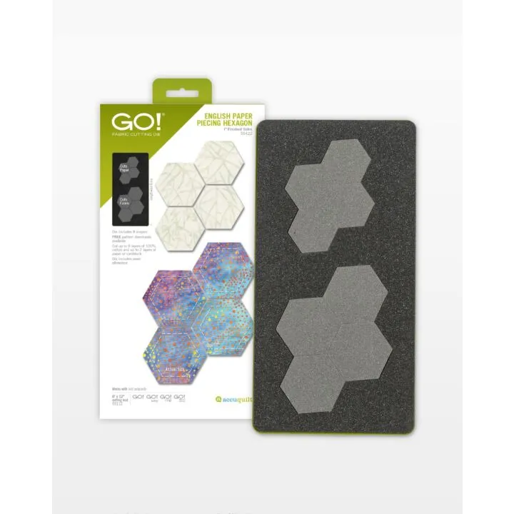 Weight in lbs.: 0.75 Cut Size: Four 1 5/16" Sides (3.3 cm) hexagons to cut fabric and Four 1" Sides (2.5 cm) hexagons to cut paper Finished Size: Four of each paper piecing hexagons: 1" Sides (2.5 cm) Die Board Size: 6 in. x 12 in. (15.2 cm x 30.4 cm)