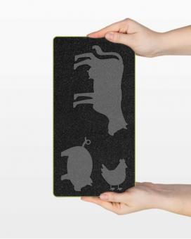Cut Size: Cow 6 3/4"W x 4"H (17.1 cm x 10.2 cm), Pig 4"W x 2 3/8"H (10.2 cm x 6 cm), Chicken 2"W x 2 3/8"H (5.1 cm x 6 cm).