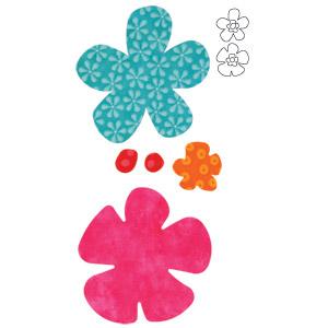 This die cuts two large flowers, a small flower and two flower centers. Embellish applique quilts, garments, home decor projects and much more! Perfect use for scraps or stash. Apply fusible web to the wrong side of fabrics and cut for applique shapes that are ready to fuse and applique. Die packaging includes project directions for a GO! Funky quilt.