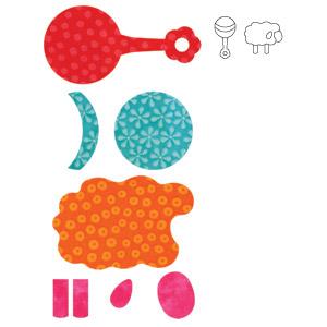 Cuts one each: Rattle 5"W x 2 1/2"H (13 cm x 6 cm), Circle 2 1/2" (6 cm), Curved Striped Accent 1"W x 2 1/2"H (3 cm x 6 cm), Sheep 4 1/2"W x 3"H (11 cm x 8 cm), Sheep Head 1 3/16"W x 1 1/2"H (3 cm x 3 cm), Sheep Ear 11/16"W x 15/16"H (2 cm x 2 cm) and 2-Sheep Legs 1/2"W x 1 1/4"H (1 cm x 3 cm).