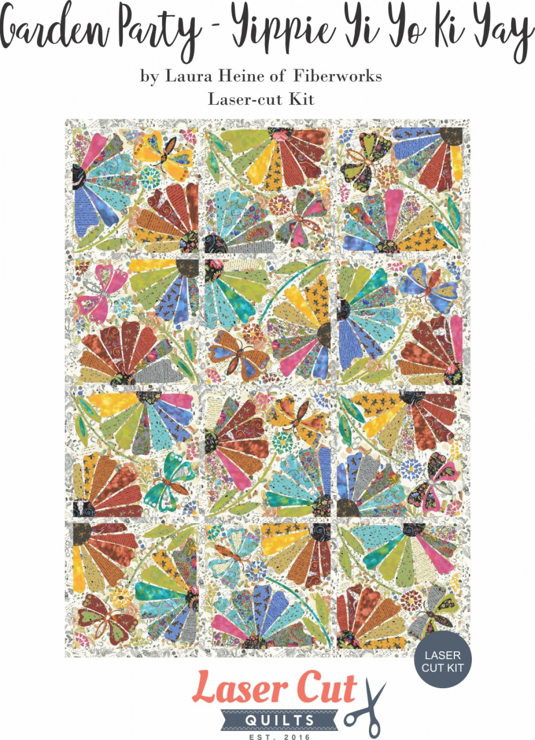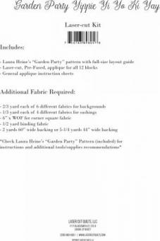 A stunning collage quilt designed by Laura Heine of Fiberworks, "Garden Party-Yippie Yi Yo Ki Yay" is a one-block wonder, featuring a single block of butterflies and floral motifs rotated into a rainbow of color. Splashes of turquoise, chartreuse, sapphire and mustard adorn this laser-cut limited time colorway. Measures 66" x 86" Kit includes: 12 months of Laser-cut Applique Pieces, fused with FlexiFuse Premium Fusible General Applique Instructions (specifying iron temperatures and what stitches to use) Laura Heine's pattern, "Garden Party" Does Not Include: Backgrounds, Binding, or Backing