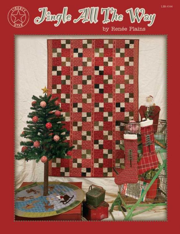 Jingle All The Way includes a 48" x 60" pieced quilt, a 22" x 32" appliqued wall quilt, stockings, rag ball ornaments, a 15" Santa & a 28" diameter appliqued tree skirt.