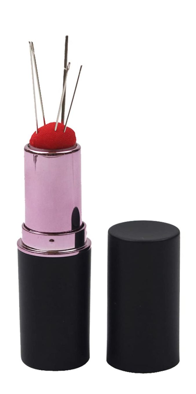Das Lippenstift-Nadel- und Stecknadeletui ist eine lustige Art, Ihre Nadeln für unterwegs aufzubewahren! Das Kissen dreht sich wie eine Lippenstifttube. Es enthält fünf Nähnadeln.