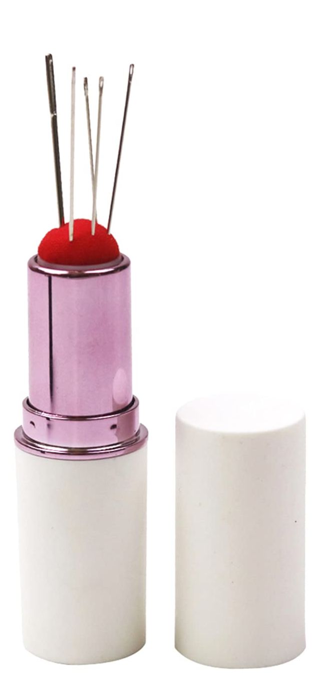 Das Lippenstift-Nadel- und Stecknadeletui ist eine lustige Art, Ihre Nadeln für unterwegs aufzubewahren! Das Kissen dreht sich wie eine Lippenstifttube. Es enthält fünf Nähnadeln.