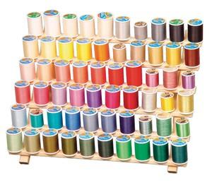 June Tailor wooden spool racks are made of fine hardwood. Holds 60 spools. Flip-out leg for tabletop use or can be hung on the wall.