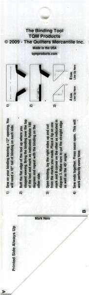 The Binding Tool is a must have tool for every quilter. When you finish the last seam of the binding only an angled seam will work to reduce the bulk of this last step. Two cuts and two measurements and you're on you way to a great finish. This tool makes a perfect ending every time. 2-1/2" x 8"