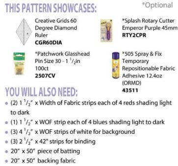 The diamond shapes are strip-pieced before cutting so it goes together very quickly and there are no inset seams! It can be made with the Creative Grids 60 Degree Diamond Ruler or the Mini version since none of the strips are wider than 4-1/2-inches.