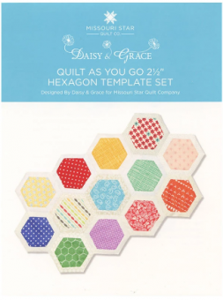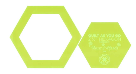 The "Quilt as you go" Hexagon template set contains 1 template for a 2 1/2" hexagon with 2 separate pieces.